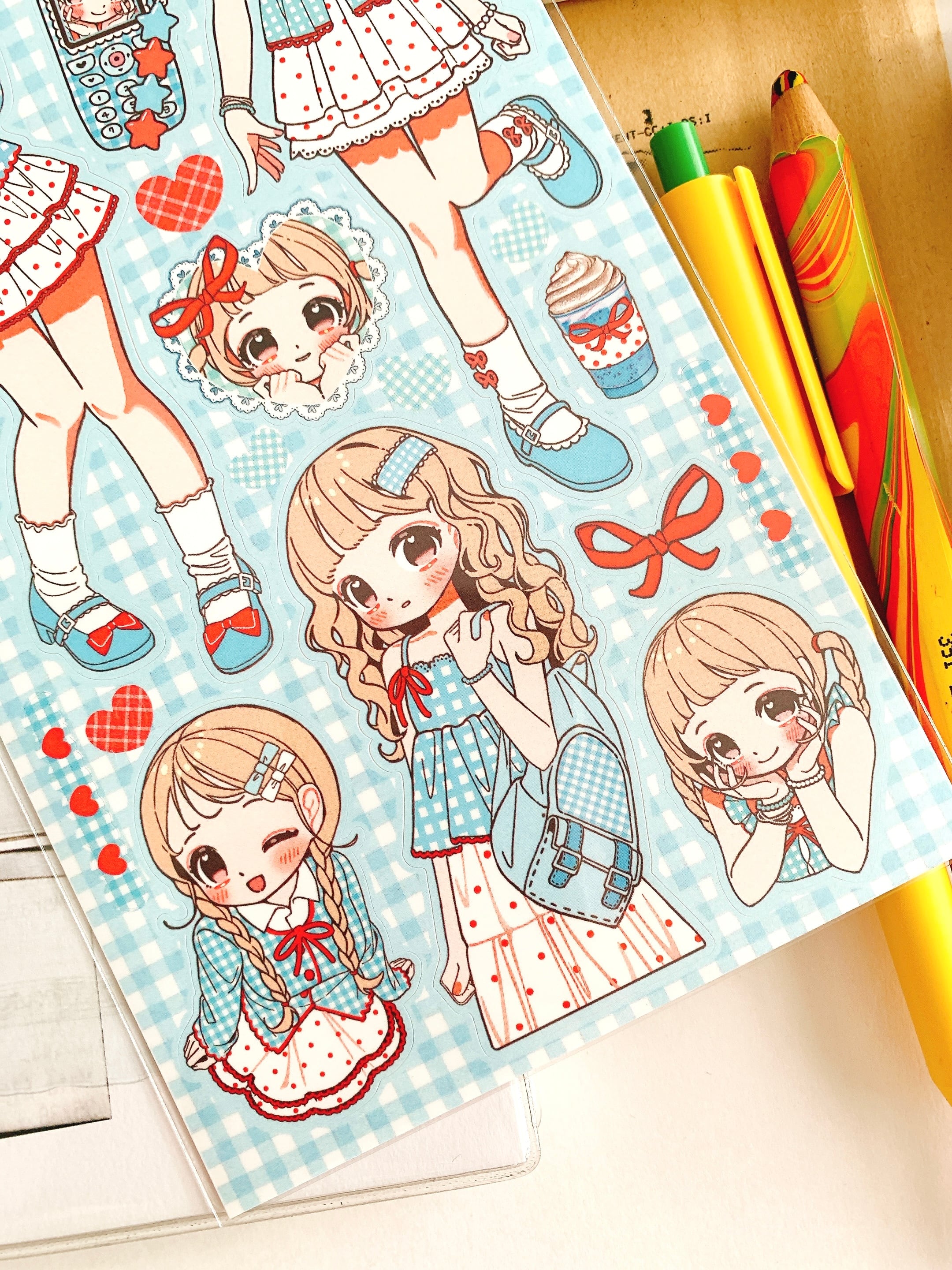韓国作家、韓国シール【ゴーストピーチ】ブルーチェックルックブッグ、 手帳デコ、推し活、ハンドメイド、美少女イラスト、可愛い韓国系