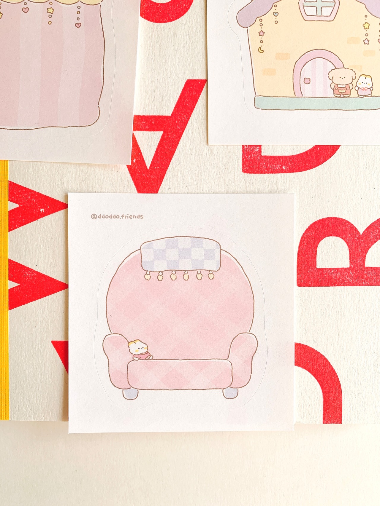 ピンクのソファ、紫の屋根のお家、ベッドこの3種類